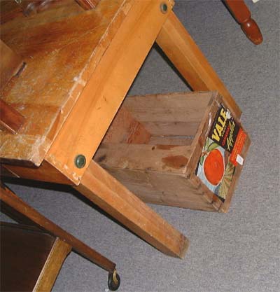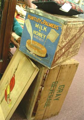 | ジャンクと紙一重のリンゴ箱。今では輸送もダンボールが主流なので、こういった木箱にも値打ちが出てきているのでしょうね。右のパンケーキ(?)の箱はイラストの色使いが素敵です。 |