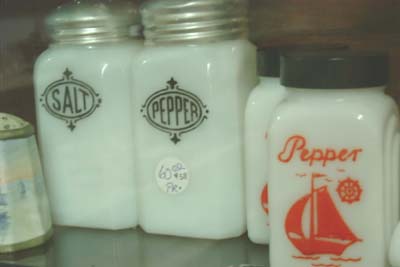 | シェーカーはコレクターズアイテム。いろんな形のかわいらしいシェーカーが並んでいました。この何の変哲もないミルクガラスのシェーカーがペアで5,000円。高い…。 |