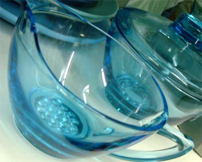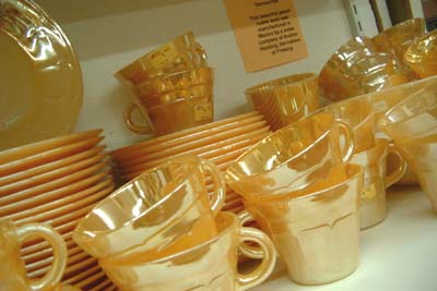 | ピカピカ光るピーチラスターのカップ&ソーサー。これが似合うキッチンにするには、気合が要りそうです。このブルーのカップも素敵。心ゆれました。 |