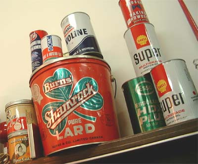 | 空き缶なんかも結構オシャレなものがあります。中央の大きな缶はラード、左に小さく見えるのは何やら食べ物のよう。右に見えるのはエンジンオイルの缶。うまく並べると素敵なインテリアになりそうです。 |