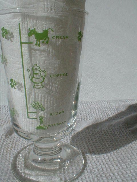| そして結局買ったのが、このアイリッシュコーヒーカップ。ウィスキー、お砂糖、コーヒー、クリームを線のところまでいれると、アイルランドの伝統的な飲み物アイリッシュコーヒーが出来るというもの。 |