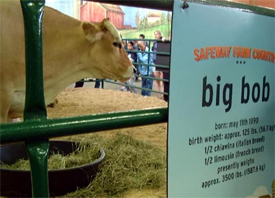 そして私がお気に入りなのが Safeway Farm Country という擬似ファーム。Safeway というのはこのあたりに多くの支店を持つ食料品スーパーマーケットの会社です。ここではここ数年、体重1.5トン以上にもなる巨大な牛が迎えてくれるのがお決まりになっています。ここには様々な種類の牛、ラマにアルパカ、羊に山羊、ターキーに鶏にハト、豚にウサギ、そしてもちろん馬など、ありとあらゆる家畜がいます。柵で囲まれてはいますが動物が近づけば触れます。子供はもちろんですが、大人も真剣な目で馬や牛を撫でています(農場関係者なのかもしれません)。毎日時間を決めて羊の毛刈りの実演や馬の蹄鉄をはめる実演、さらにはお腹の大きい牛がいればお産まで目の前で見ることができて(もちろん時間が合えばですが)本当に教育的だと感じます。動物に直接触って遊べる Petting Zoo や、干草の敷き詰めてある広場も子供たちに大人気です。