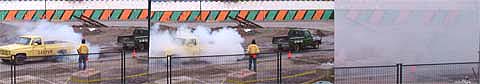 | 車の引っ張りあい。最後には煙でどっちが勝ったかわかりません。観客席も雲の中、ゴムの焼けた臭いが充満。それでもみんな楽しそう。 |