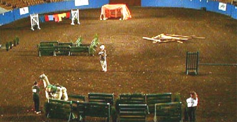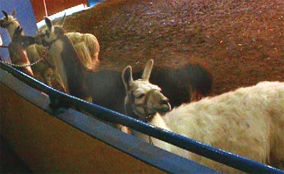 「ラマ・パッキング」という種目。南米原産のラマ(ラクダ科の動物)は荷物を運ぶ(パッキング)を役目があるそうです。競技はラマのパッキング能力を競うもの。飼主がラマに荷物をくくりつけるところから始まり、ラマが各種障害物(細い通路、バー、丸太、後ろ向きで通る通路、植木、干してある洗濯物)をクリアし、ラマ小屋(写真上部のテント)の手前で飼主がパッキングを下ろして、ラマが小屋に後ろづさりで入って座って終わりです(中央にいるのが審査員)。ラマによっては小屋に入りたがらなかったり、後ろ歩きしたがらなかったりで飼主も必死。